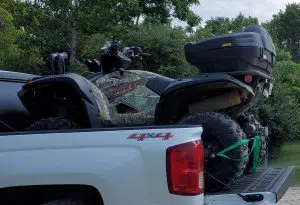 Stolen is a 2020 Torque camper trailer, 33 feet in length, with white sides and black and brown markings with Ontario license plate #T4879T. Also missing is a camouflaged 2021 Yamaha YF7 ATV with Ontario plat 8VC53 and a Champion generator.